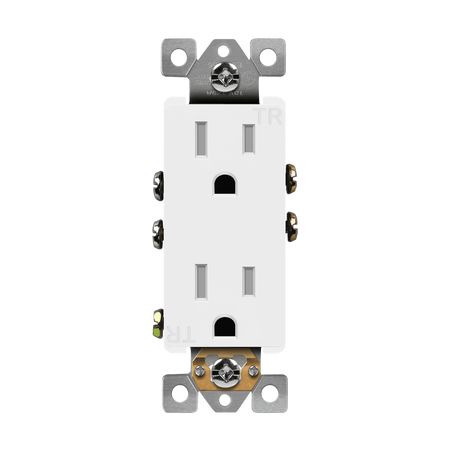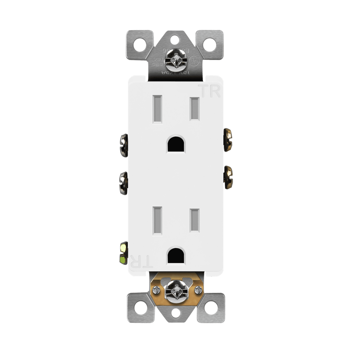 Outfit your home with the Enerlites 61501-TR-W duplex receptacle for a powerful and stylish wall plug. Operating at 15 Amps with a white finish, this tamper resistant receptacle reduces the risk of electrocution by making it more difficult to insert foreign objects. This feature helps ensure the safety of your children and loved ones. It also comes with a green hex-head ground screw to make installation safer and easier.