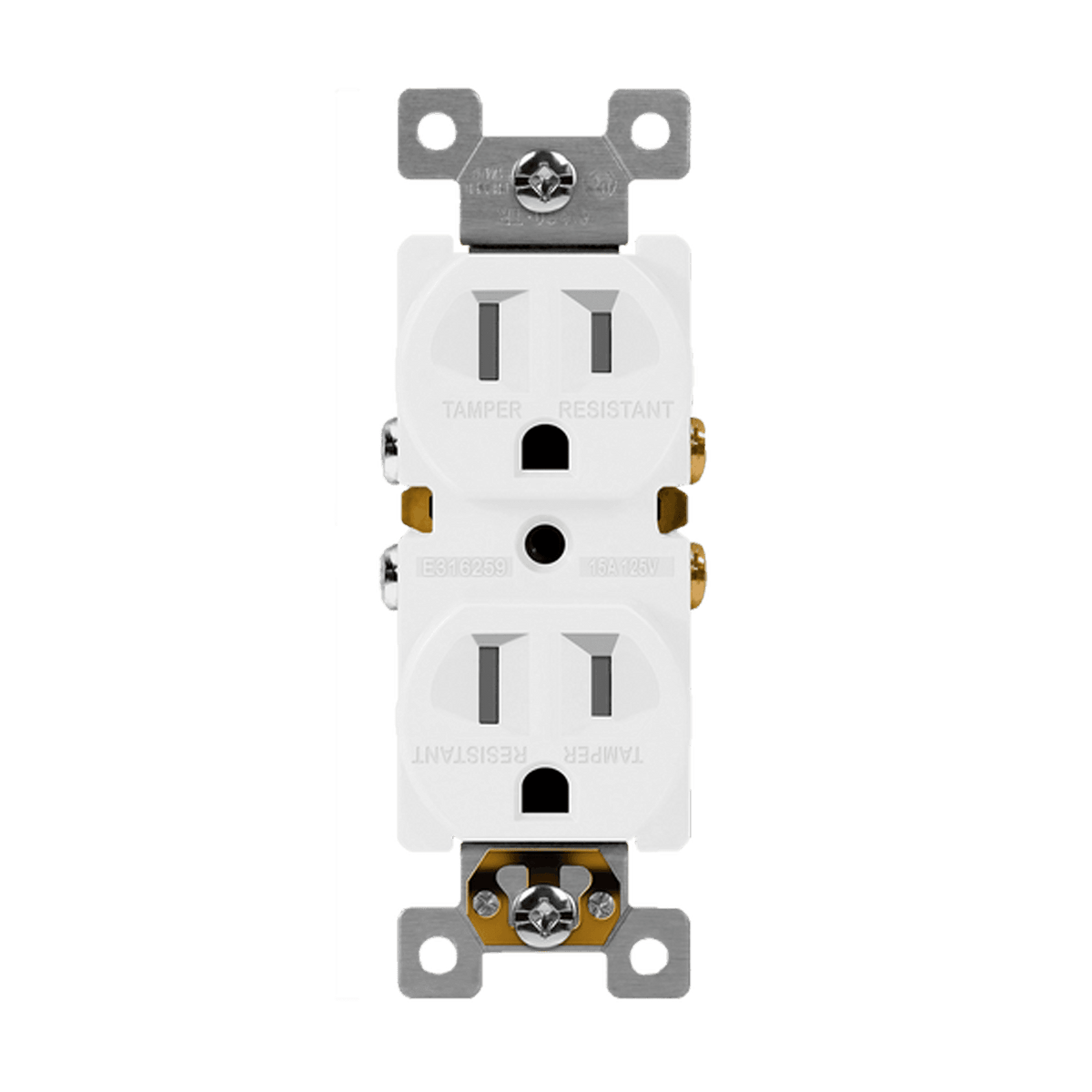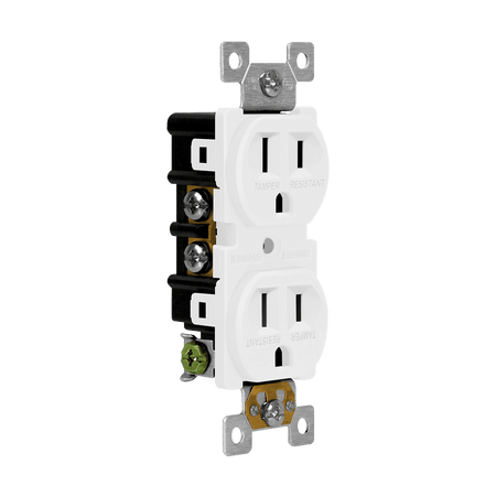 Self-grounding tamper-resistant receptacles are made of high-impact resistant polycarbonate thermoplastic for long service lives. The shallow body design is for maximum wiring capability, with backstab or side options available. Tamper-resistant shutters prevent insertion of foreign objects into the device. These residential grade receptacles are suitable for use in homes, apartments and condominiums. They are also applicable for commercial use in corporate buildings, hotels, restaurants and locations that only require a 15 amp outlet.