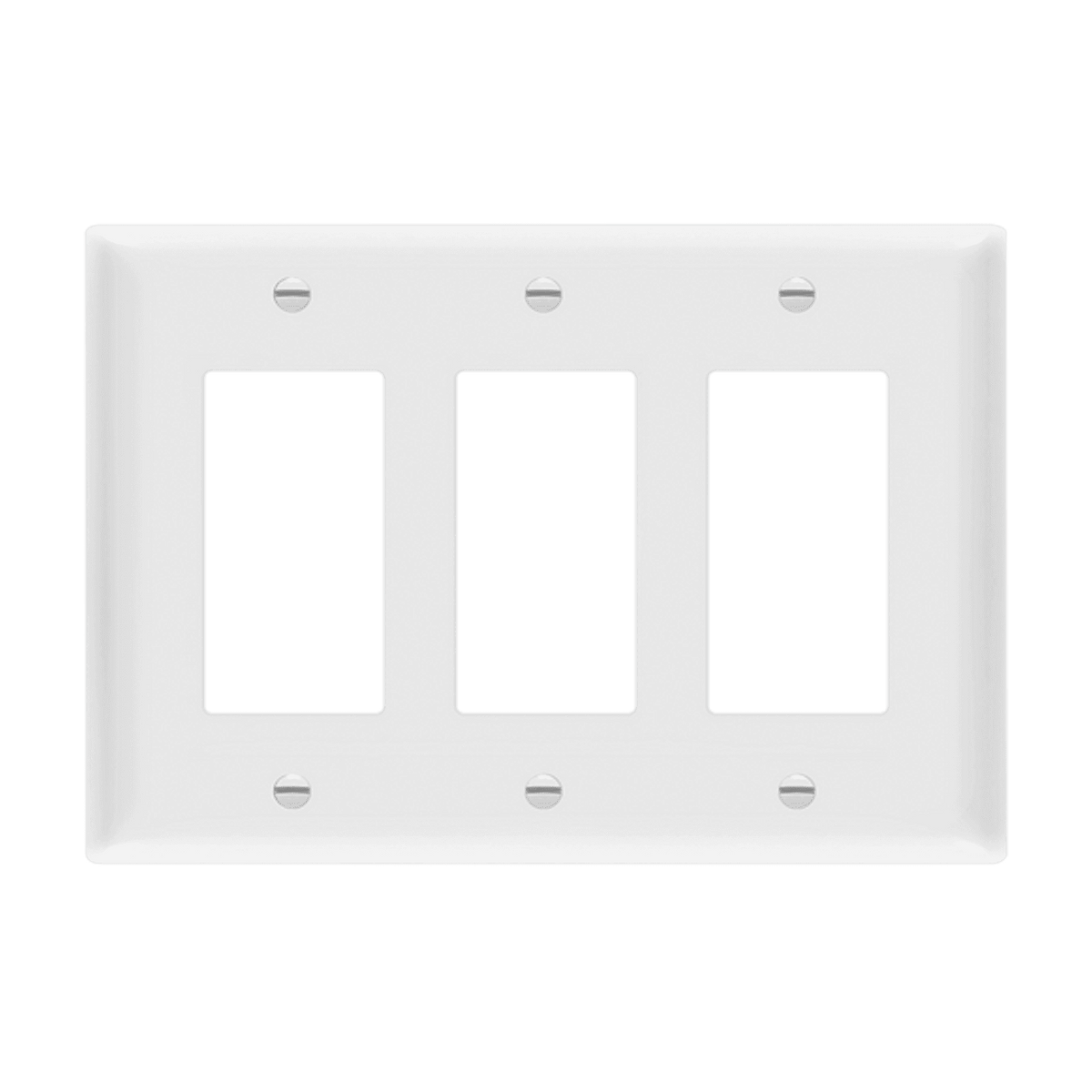 This is a 3-gang, mid-size Decorator/GFCI wall plate. Enerlites polycarbonate thermoplastic wall plates are manufactured to provide durability, flexibility, and resilience to bending and high impacts. They are also heat and fade-resistant to temperatures over 100 degrees, which protects them from fading and discoloration over time, and have a flammability rating of UL94, V2. Their smooth finish provides an attractive look and makes them easy to clean.