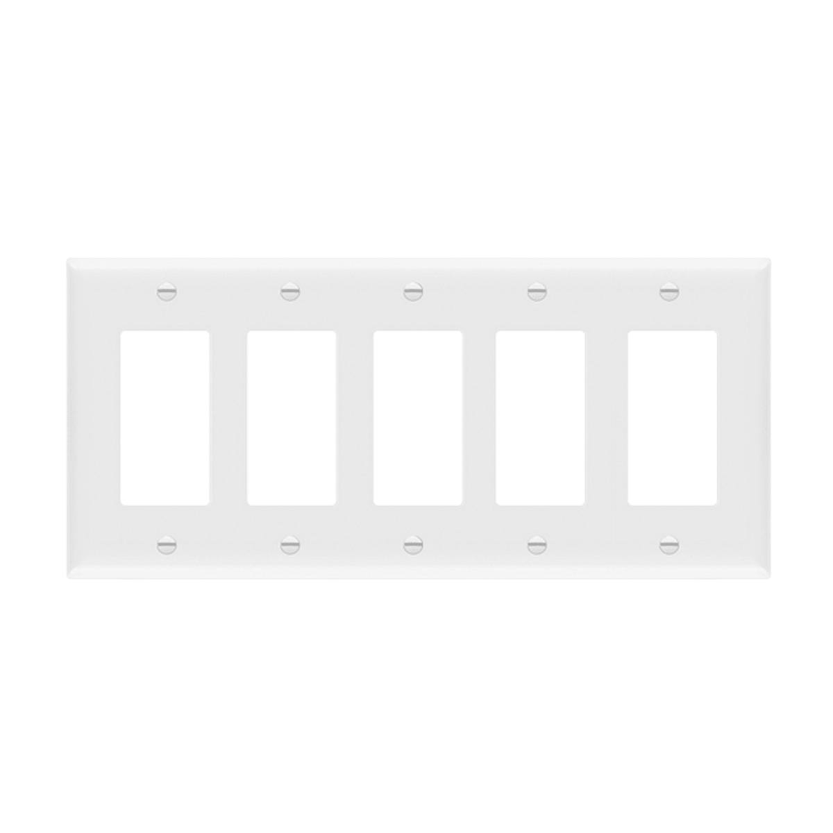 This is a 5-gang, mid-size Decorator/GFCI wall plate. Enerlites polycarbonate thermoplastic wall plates are manufactured to provide durability, flexibility, and resilience to bending and high impacts. They are also heat and fade-resistant to temperatures over 100 degrees, which protects them from fading and discoloration over time, and have a flammability rating of UL94, V2. Their smooth finish provides an attractive look and makes them easy to clean.
