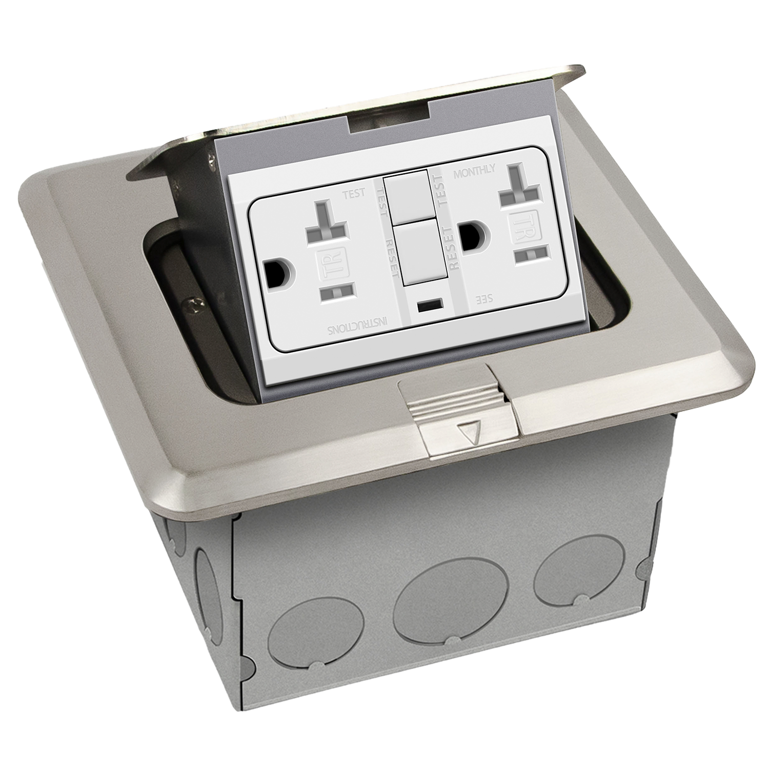 The ENERLITES 961243-S-GFCI is a 1-gang nickel-plated brass square pop-up floor box assembly with a tamper-resistant, GFCI receptacle. The device features 20A tamper-resistant duplex receptacles, which include internal shutters to prevent the insertion of foreign objects. The floor box easily pops up for easy access to power; simply snap the cover closed when not in use.