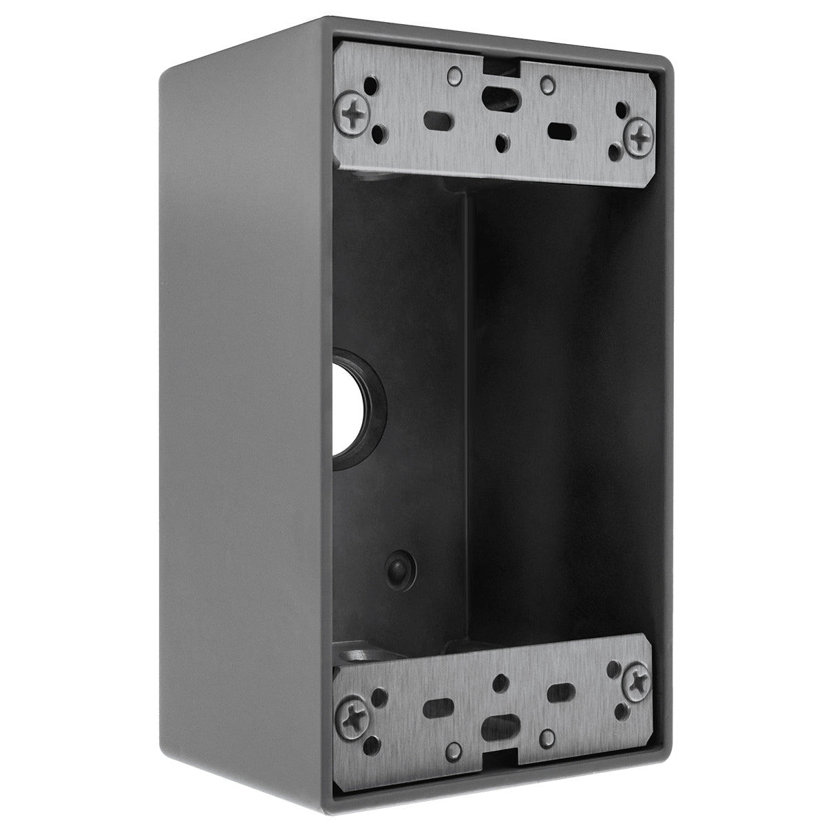 The ENERLITES EN1350 weatherproof outlet box is a single-gang electrical box that features three 1/2-inch diameter knockouts. This 1-gang outlet box is designed specifically for installing switches and receptacles in moisture-prone or outdoor locations. The electrical box features a die-cast metal construction that seals out moisture, dust, debris, and insects to keep receptacles protected year-round and through any weather conditions. The gray-colored junction box is also powder coated for maximum scratch and corrosion resistance. This 1-gang weatherproof box is compatible with standard toggle switches, duplex receptacles, decorator switches and receptacles, and GFCI receptacles. The junction box is compatible with 1-gang weatherproof covers, such as ENERLITES models IUC1V-D, IUC1VH-D, 8831-WPV, 8831-WPH, 8821-WPV, 8821-WPH, or 7701-WP (wall plates sold separately). The outdoor outlet box comes with a pre-installed grounding screw, closure plugs, mounting lugs, and installation screws to make installation as fast and easy as possible. This product is UL and CUL listed and complies with NEC 2017 406.9 for a weatherproof enclosure in damp locations.