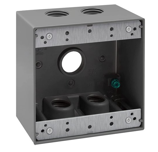 The ENERLITES 2575 weatherproof outlet box is a double-gang electrical box that features five 3/4-inch diameter knockouts. This 2-gang outlet box is designed specifically for installing switches and receptacles in moisture-prone or outdoor locations. The electrical box features a die-cast metal construction that seals out moisture, dust, debris, and insects to keep receptacles protected year-round and through any weather conditions. The gray-colored junction box is also powder coated for maximum scratch and corrosion resistance. This 2-gang weatherproof box is compatible with standard toggle switches, duplex receptacles, decorator switches and receptacles, and GFCI receptacles. The junction box is compatible with 2-gang weatherproof covers, such as ENERLITES models IUC2V-D or 7702-WP (wall plates sold separately). The outdoor outlet box comes with a pre-installed grounding screw, closure plugs, mounting lugs, and installation screws to make installation as fast and easy as possible. This product is UL and CUL listed and complies with NEC 2017 406.9 for a weatherproof enclosure in damp locations.