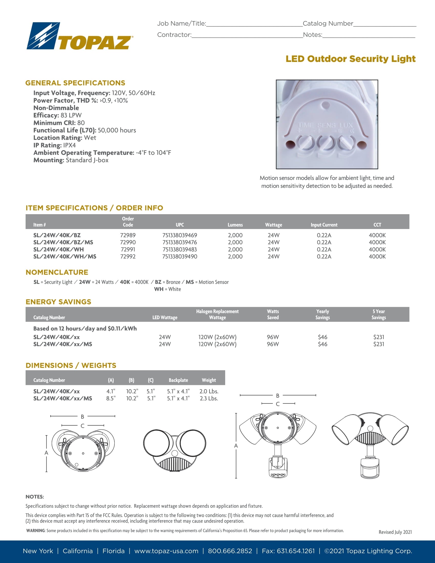 Topaz’s 24W White Security Lights combine crisp illumination with a sleek, clean housing. Lamp heads can be adjusted without tools and allow light to be directed where it is needed most. Fixtures can be mounted horizontally or vertically on standard J-box. These lights are sure to complement any building or home facade.